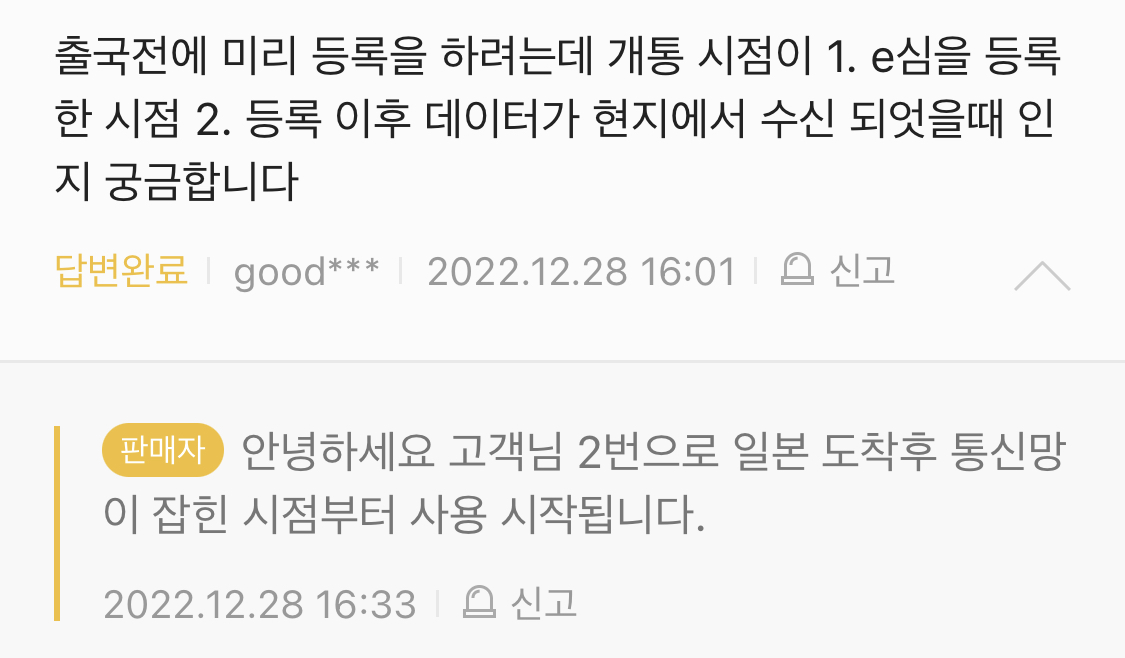 개통 시점: 일본 도착 후 통신망 잡힌 시점부터