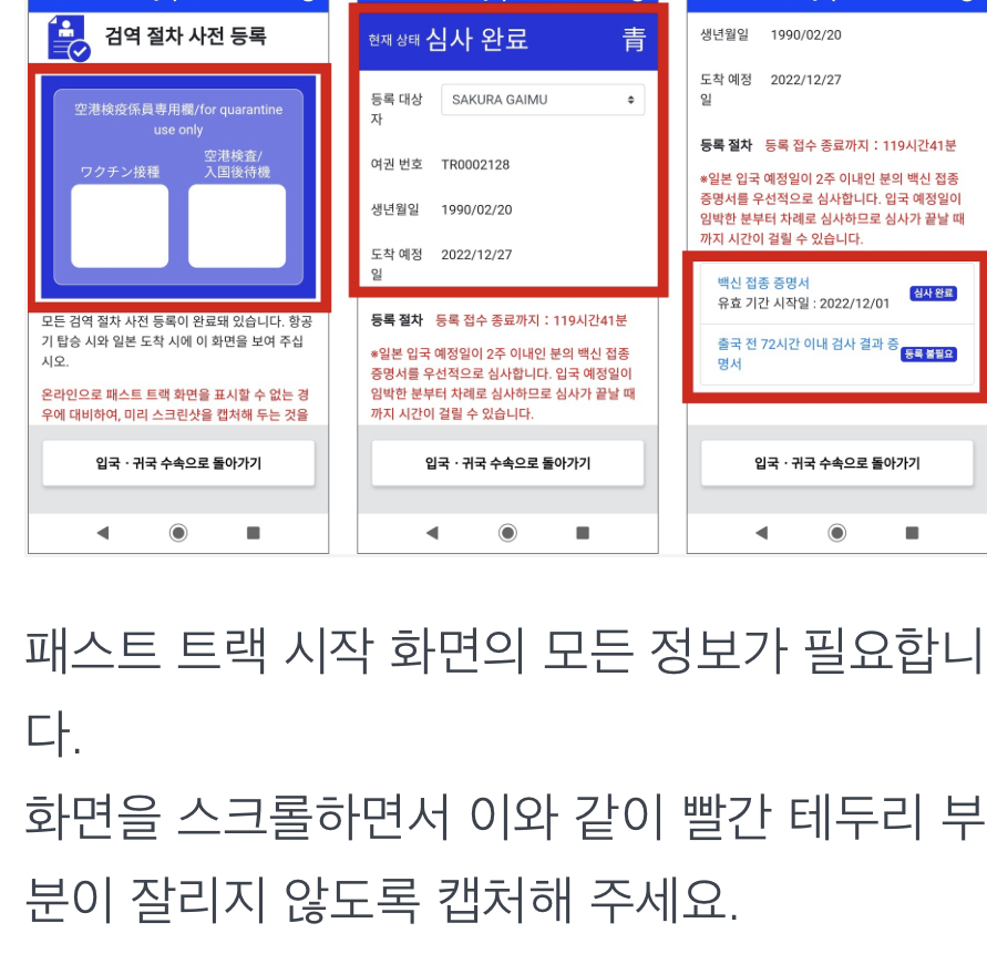 검역신고 시 백신 접종증명서(또는 PCR 음성확인서) 종이 출력물을 보여주면 되고, 입국신고 및 세관신고시에는 영어로 작성한 종이 입국신고서 및 세관신고서를 보여주면 된다. (작성 내용: 영어 이름, 여권번호, 일본 호텔 영문 주소 및 연락처 등등)