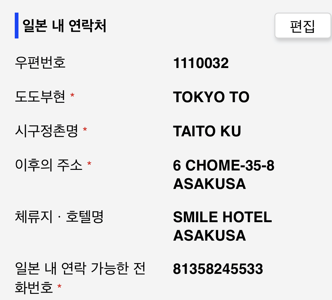 일본 주소를 등록해야 한다. 첫날 묵는 숙소 주소와 전화번호를 입력하면 된다.