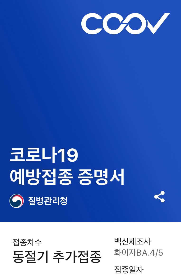 COOV 앱에 예방 접종 내역 연동하면 이렇게 3차(또는 동절기 추가접종) 접종 완료 내역이 뜹니다. 인천공항에서는 이걸 보여주면 됩니다.