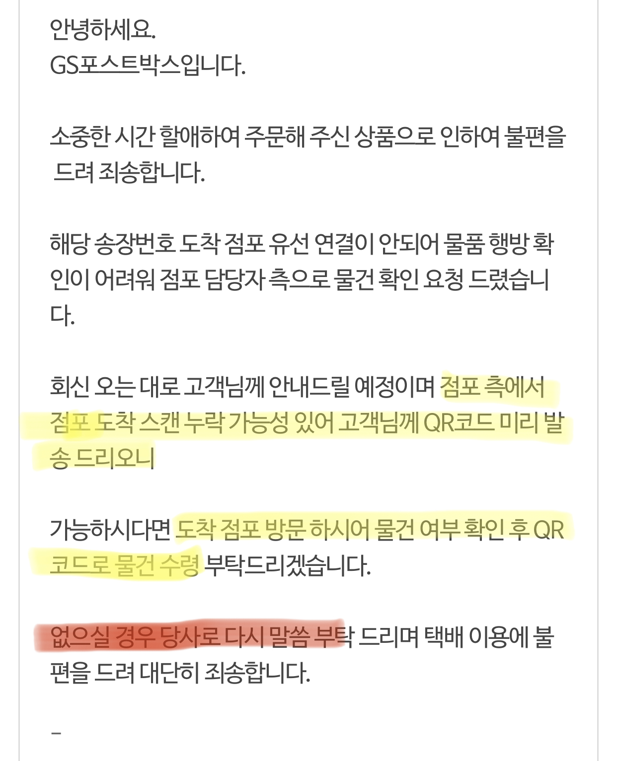 내 경우는 진짜 분실이었다. 맨 처음 고객센터에 전화했을 때 물류센터부터 물건 추척해보겠다고 하셨다. 그렇게 하루 기다렸는데 물류센터 그 어디에도 내 물건은 없었다. 관련해서 이어서 상담해야 하는데 오후에는 고객센터 전화 연결이 너무 안 돼서 지에스 홈페이지에 1:1 문의글 남겼다.