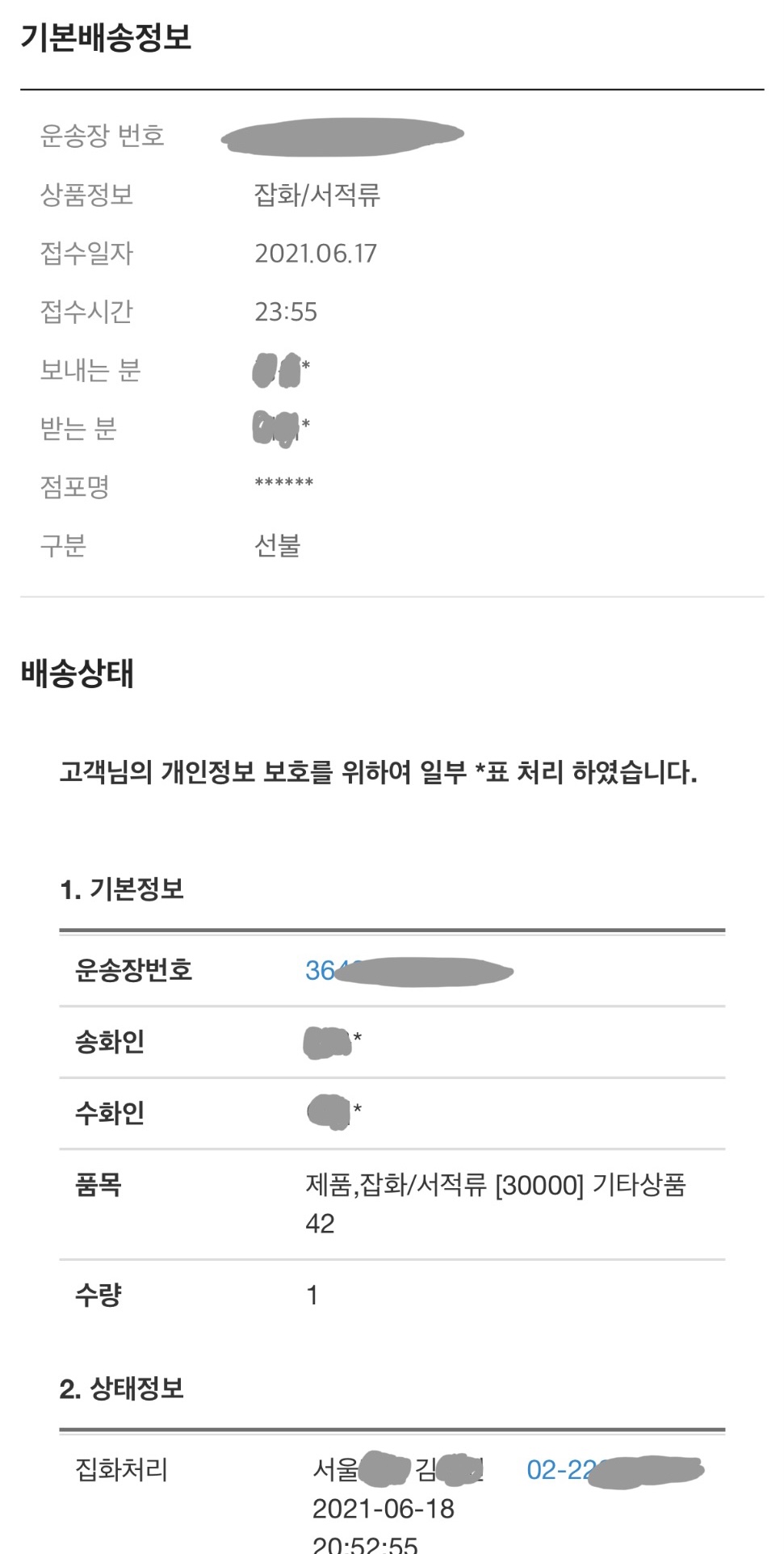 택배 보내면 운송장번호 찍힌 고객보관용 영수증 주는데, 택배 보내는 사람 입장이라면 그 종이 잃어버려도 운송장번호 알 수 있다.