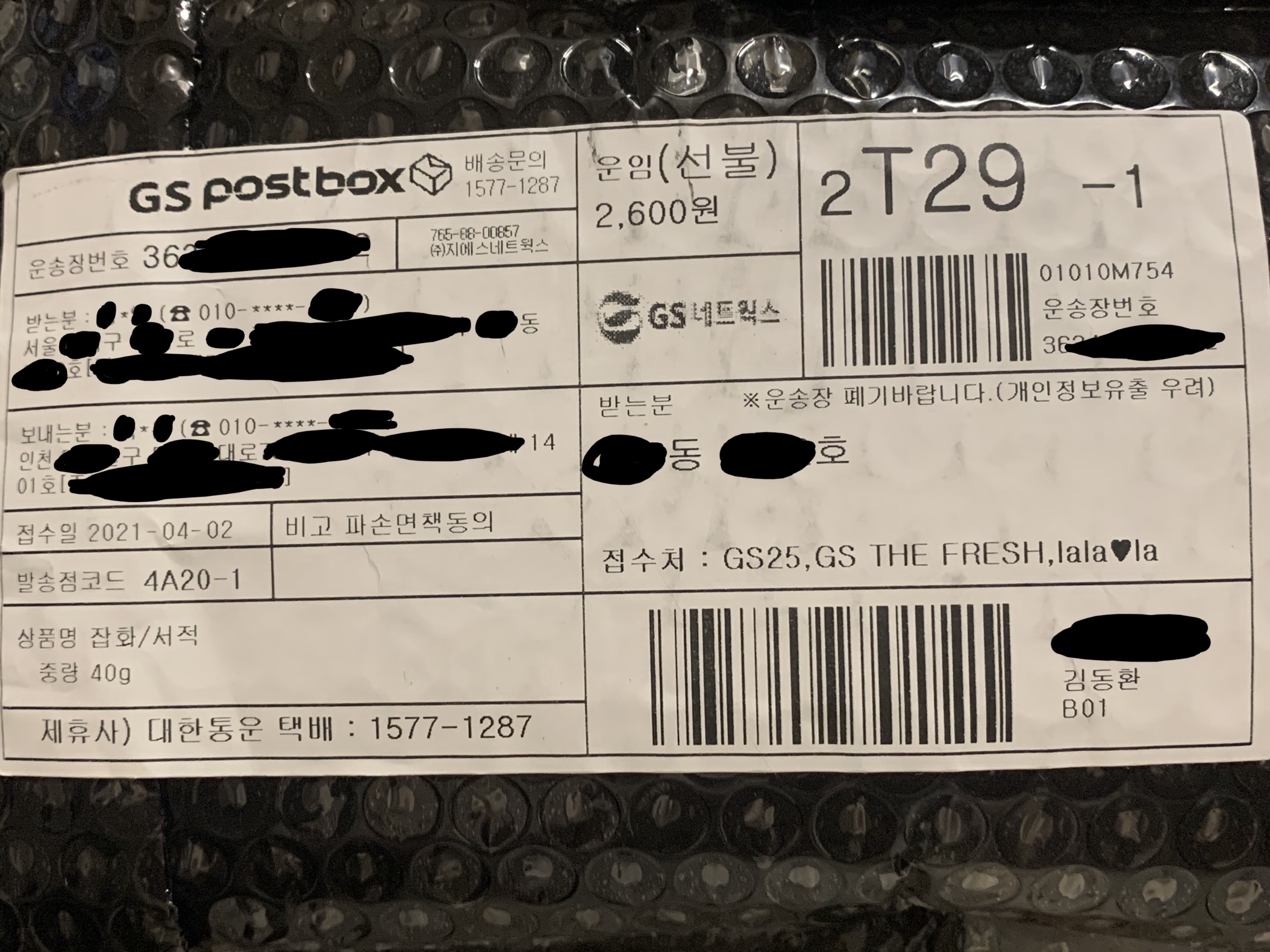 :: 지에스는 보내는 사람 이름 가운데 가려지고, 핸드폰 번호 가운데 가려지고, 주소는 동 호수까지 전부 다 표시된다.