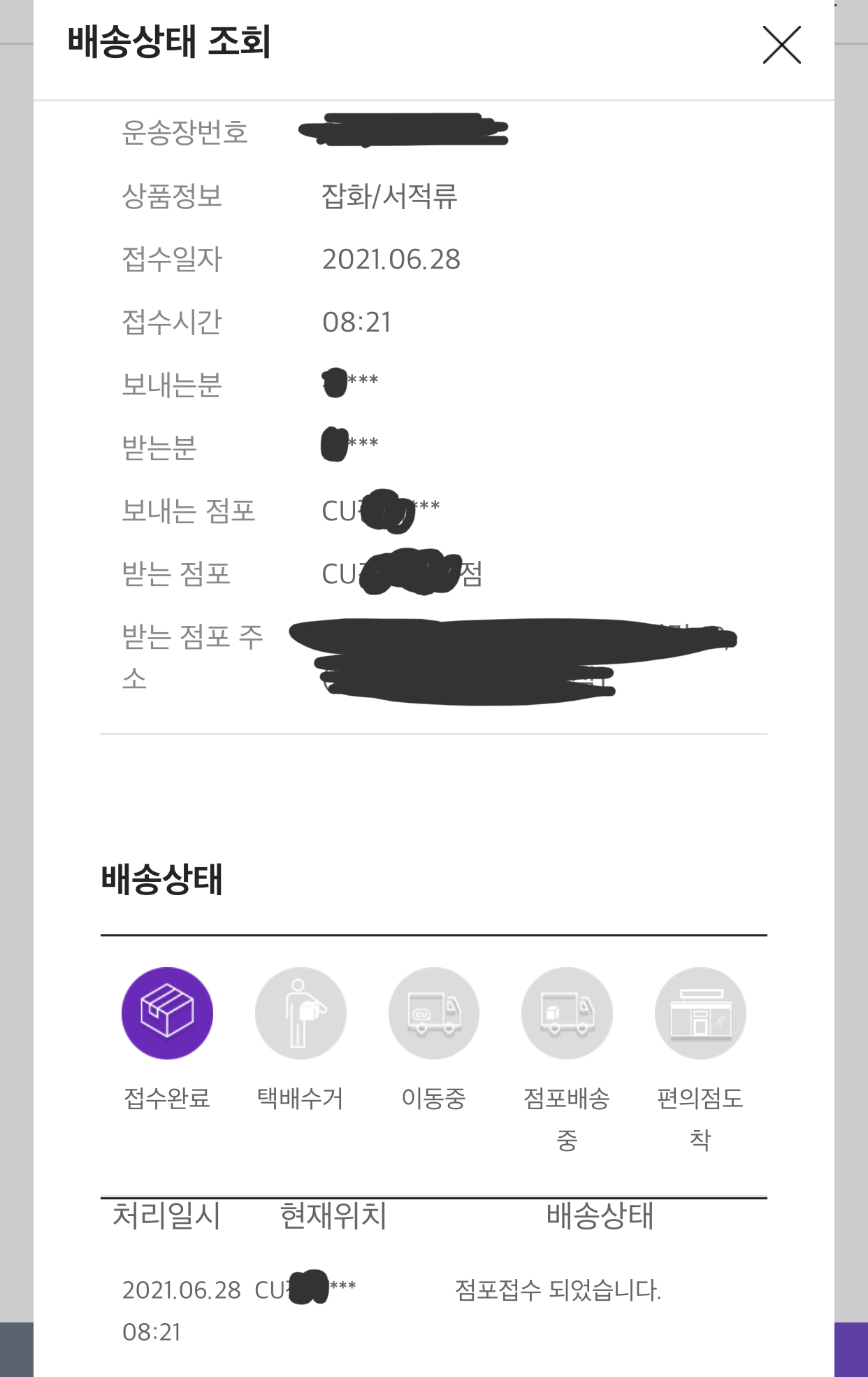 CU의 경우, 일반택배든 반값택배든 점포에 택배 접수 후 5~10분 정도 지나면 송장 번호 조회시 접수 일자와 접수 시간이 뜬다.